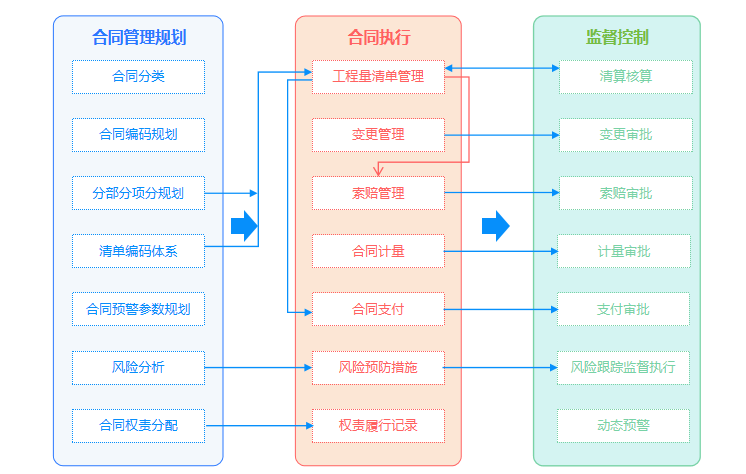 合同管理從工作包定義開始,包括合同起草、合同簽訂、文本管理、結(jié)算安排、執(zhí)行進展、合同變更、到實際結(jié)款以及對合同結(jié)款情況統(tǒng)計分析的全方位管理控制,建立一套針對項目的完善招采策劃和控制體系,實現(xiàn)招采內(nèi)容明確、邊界清晰,招標平臺化、電子化,確保招標采購客觀公正。