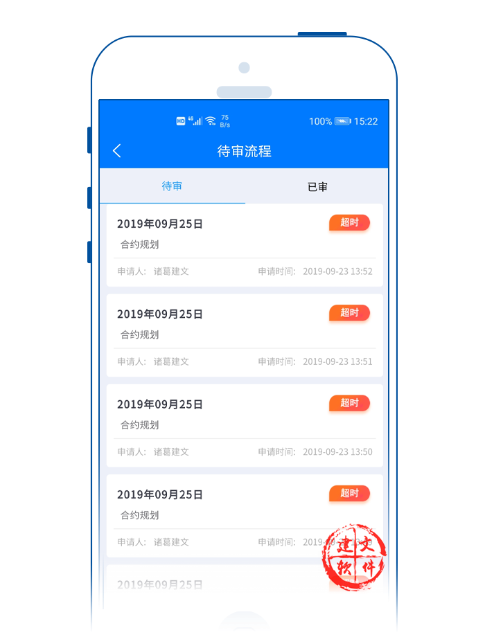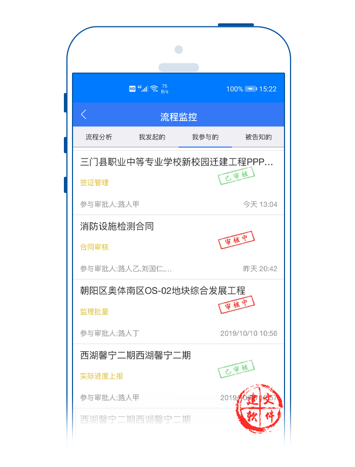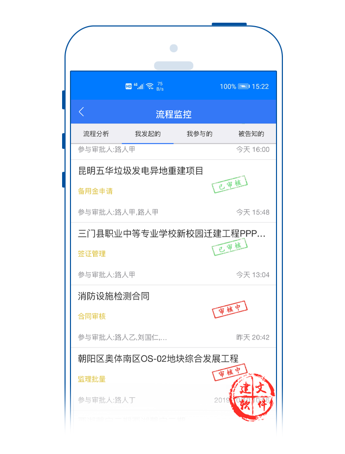 建文流程審批APP對項(xiàng)目各個(gè)審批節(jié)點(diǎn)時(shí)限進(jìn)行分類預(yù)警。打開建文建文app,可以看到各個(gè)項(xiàng)目都用不同的顏色代表實(shí)時(shí)進(jìn)展?fàn)顟B(tài):