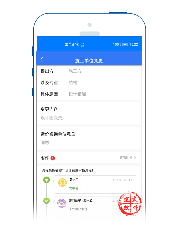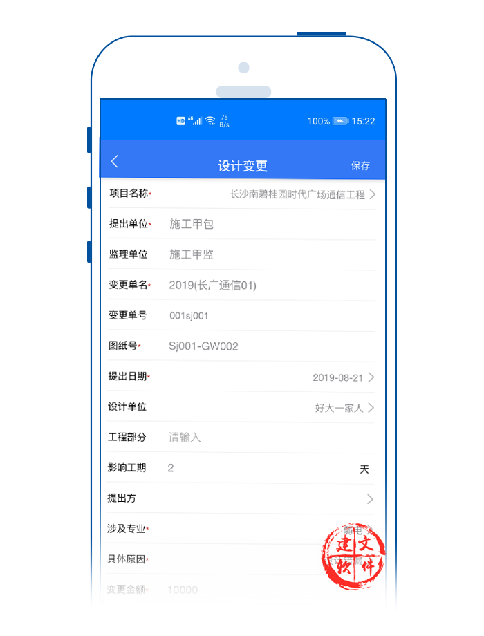 3)APP支持在線多方會(huì)審設(shè)計(jì)變更;監(jiān)理、建設(shè)單位、設(shè)計(jì)方、施工方、業(yè)主方經(jīng)過在線確認(rèn)后,由設(shè)計(jì)方通過APP發(fā)出相應(yīng)圖紙或說明,并由監(jiān)理工程師通過建文app,在線簽發(fā)設(shè)計(jì)變更單。