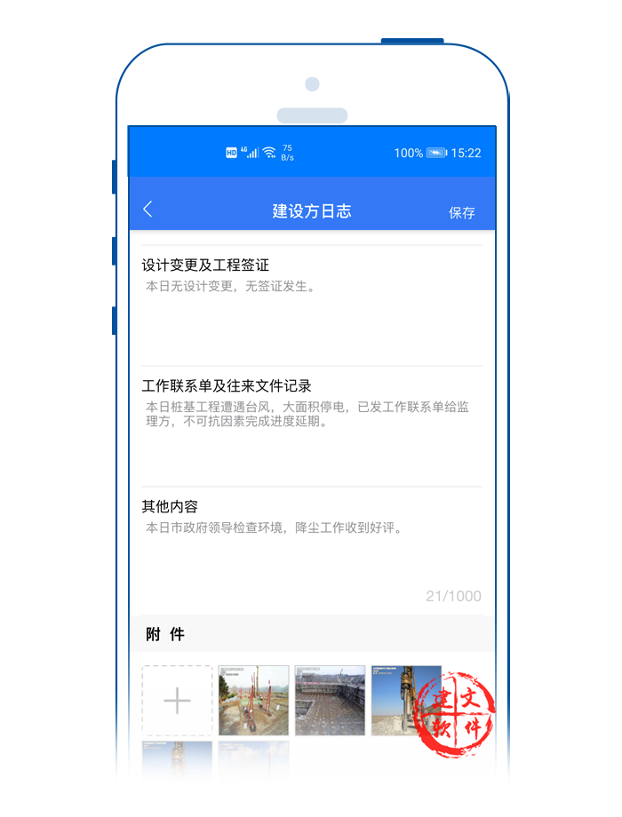 借助建文app“互聯(lián)網(wǎng)+施工日志”,一改傳統(tǒng)紙質(zhì)記錄不易修改,難以保存的問題。同時(shí),結(jié)合實(shí)時(shí)拍照、短視頻等技術(shù)手段,每天一篇施工日志,對工作發(fā)現(xiàn)問題,隨時(shí)記錄。用戶可以通過建文APP設(shè)置提醒時(shí)間和方式。每天提醒記錄,日志數(shù)據(jù)保存云端,或下載存儲(chǔ)打印。